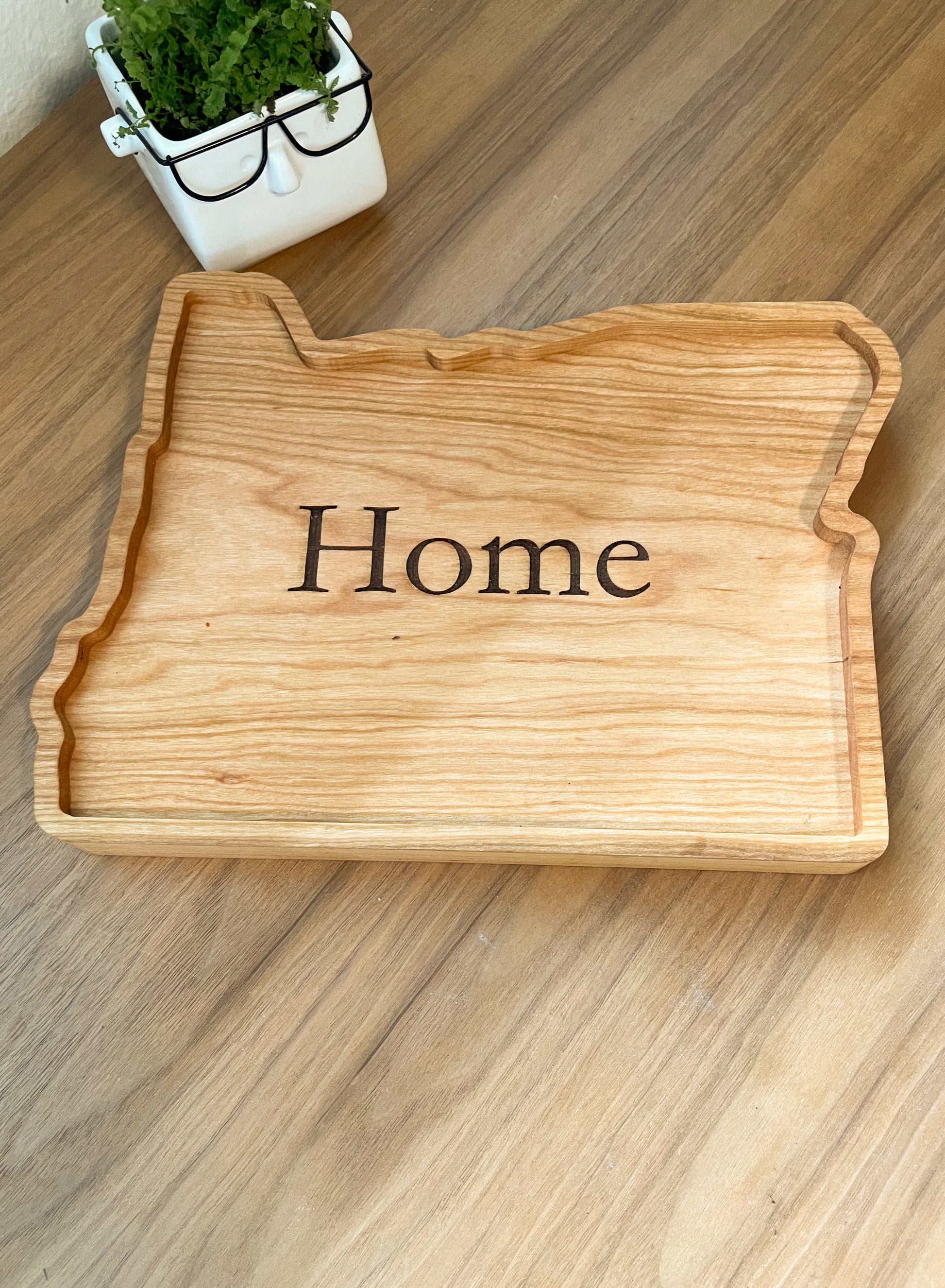Beautifully crafted catch all tray in the shape of Oregon. Made from solid cherry wood this piece is a great way to keep all your small accessories organized. Enjoy a nice landing spot for your keys, wallet, and phone at the end of the day.